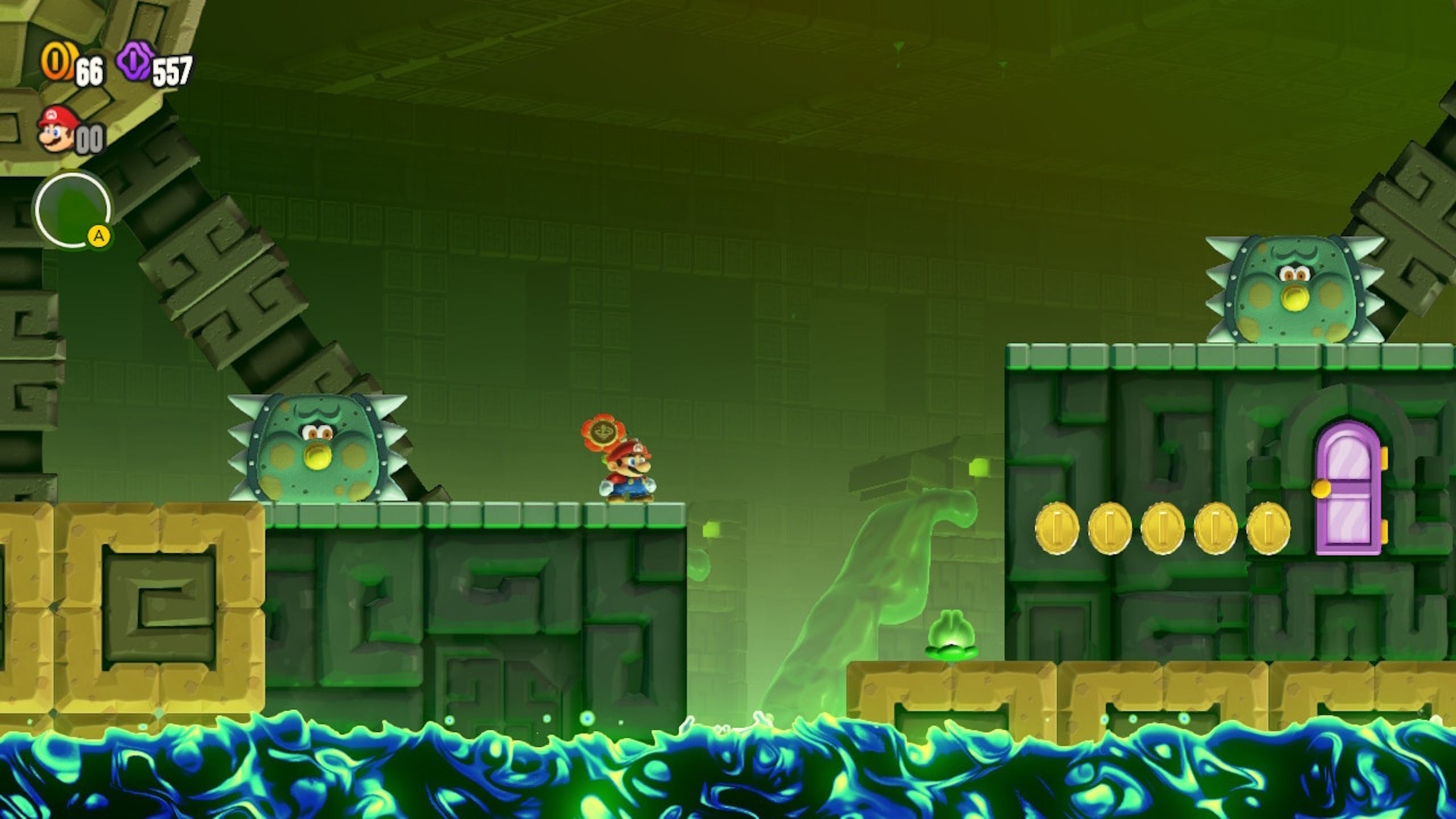 关卡中的尾尾会倒吊在上方,可以按下Y拉尾尾垂下的拉环,就能把怪物打飞。 要叫出惊奇花需要打飞3个尾尾,触碰惊奇花进入异世界后会需要回答几个题目,在时间内答对3次就能得到种子,问题很基本很容易答对。