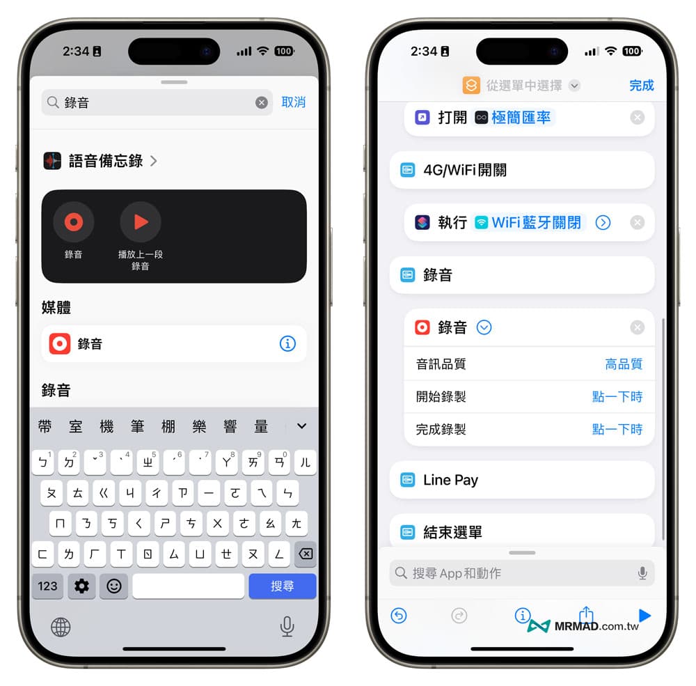 如果是经常需要透过iPhone手机录音,同样可以将这功能整合到动作按钮功能菜单内,只要搜寻「录音」动作指令,并且将录音功能拖曳到对应菜单下方,设定好音频品质,后续点击录音菜单功能,就会立即启动录音。